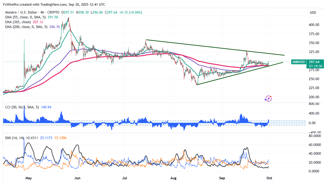 XMRUSD showed a pullback after a minor sell-off from the temporary top $326. It hits an intraday high of $299.53 and is currently trading around $297.86.