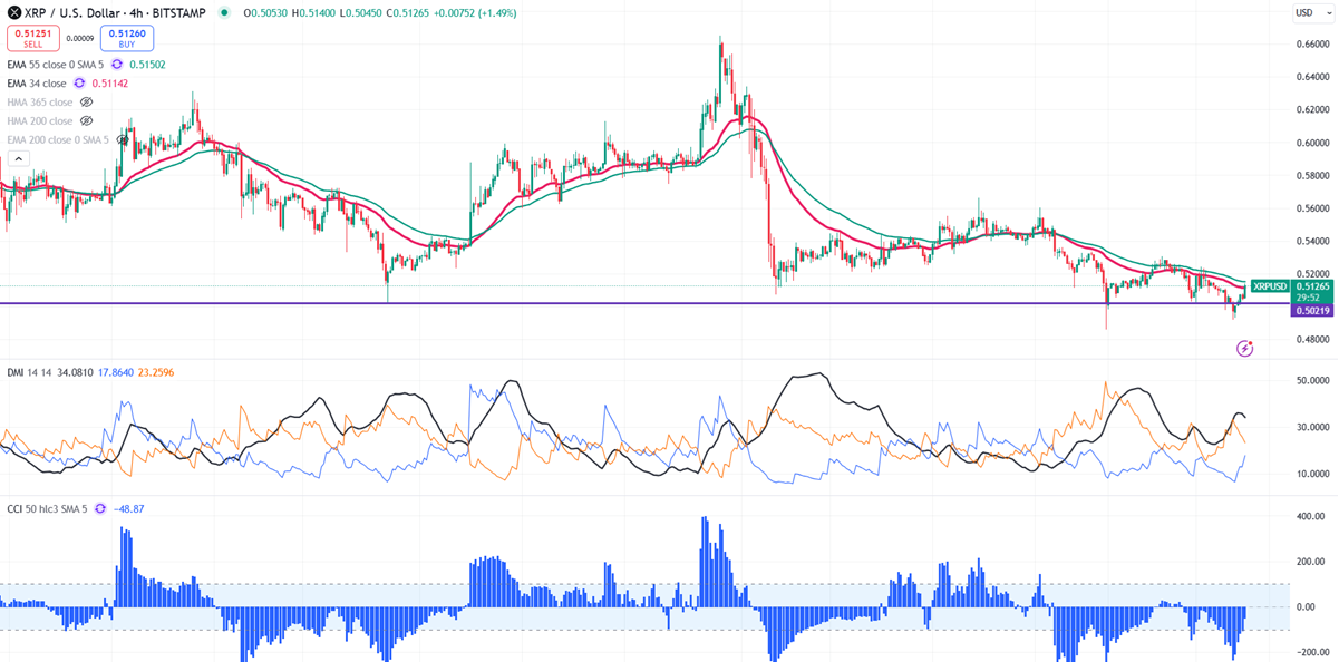 XRP/USD experienced a slight pullback following a significant sell-off, reaching a high of $0.51342 and currently trading around $0.51365.