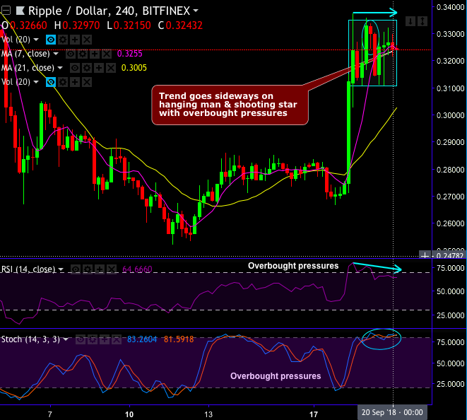 After streaks of bullish rallies that have now gone above DMAs upon doji and a stern bullish engulfing candle formation, trend now drifts into sideways on hanging man and shooting star patterns at 0.32989 and 0.32656 levels respectively (refer 4H chart).