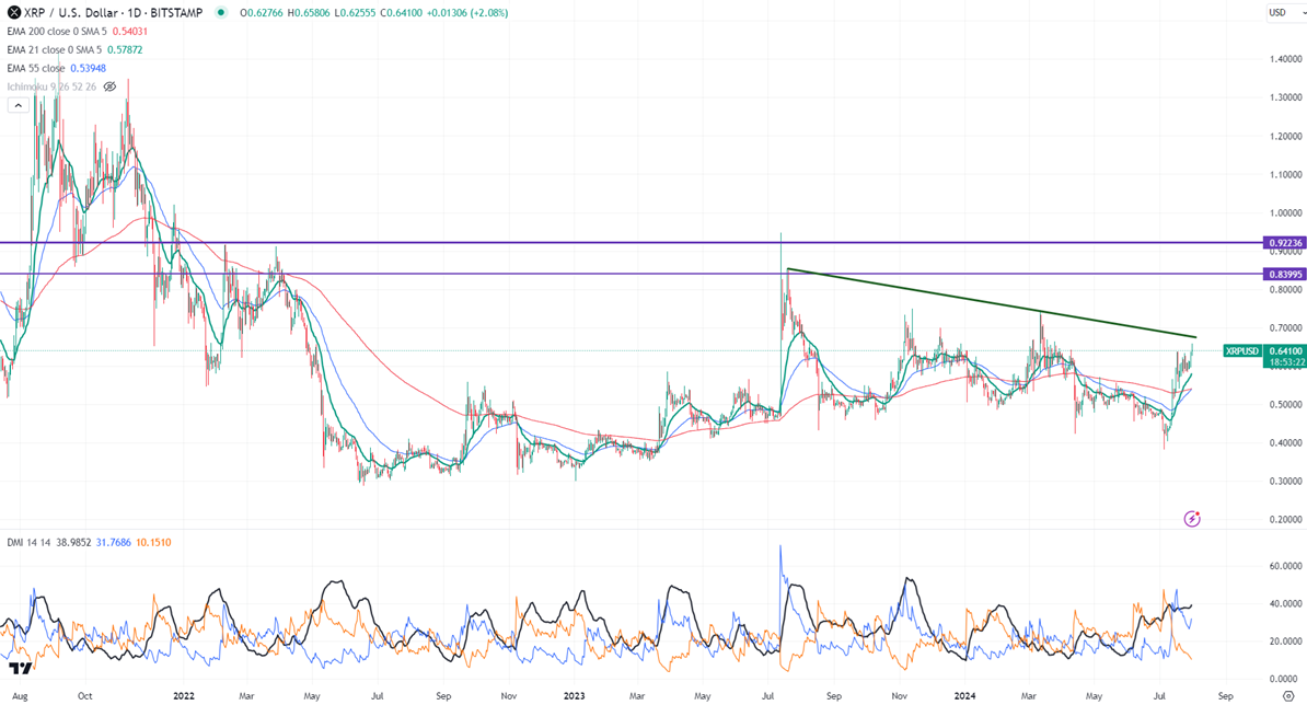 XRPUSD prices have surged more than 70% in the past three weeks. It hit a high of $0.6580 at the time of writing and is currently trading around $0.64