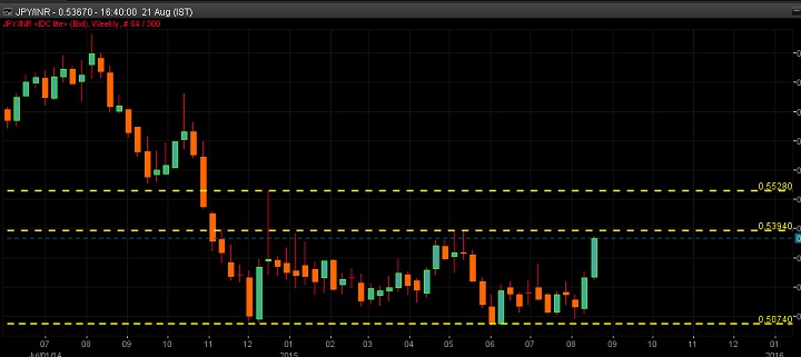 Yen is currently trading at 0.536 against INR. Range floor stands at 0.507-0.51 and resistance lies at 0.528 (broken this week), 0.54 and 0.55.