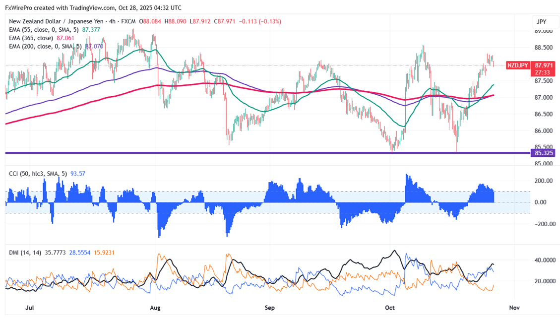 NZDJPY pared some of its gains as yen showed a minor pullback. The intraday trend is bullish as long as support at 86.95 holds. Having reached an intraday low of 87.91, it now trades around 87.95.