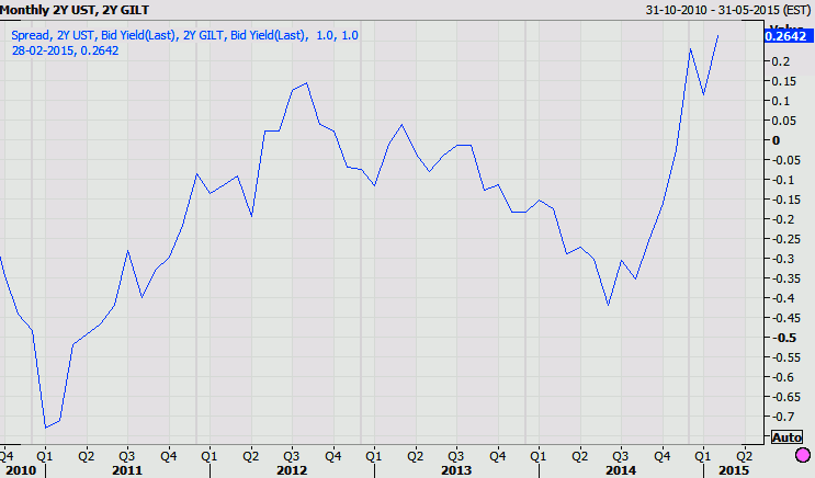 The yield spread between the two year US treasury and UK Gilt has increased steadily, tilting the balance in favor of the US. The differential has risen sharply since the mid of 2014, as the Fed was nearing to the winding of its QE programme.