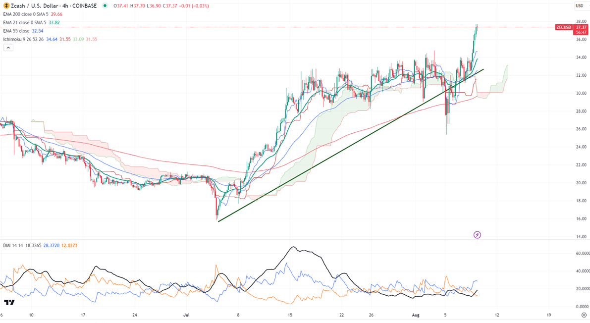 ZECUSD gained more than 45% in the past three days. The pair holds above the short-term (21 and 55 EMA) and the long-term moving average in the 4-hour chart. It hit a high of $37.70 and is currently trading around $37.28.