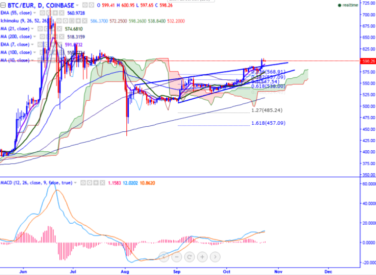 BTC/EUR is seen trading slightly below on Monday, after its increase. The pair breaks the temporary top formed at 588 and jumped till 605 levels (COINBASE).It is currently trading around 598.8 at the time of writing.