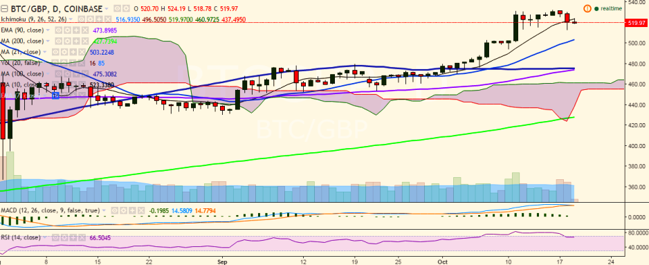 BTC/GBP is moving south after hitting a high of 532.69 on October 16. It has slipped below 10-day MA and is currently trading at 519.98 levels at the time of writing (Coinbase).