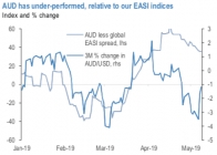 Despite local data continuing to out-perform relative to the global data flow (refer 1stchart), AUDUSD has under-performed of late, kept in check by a slow-burning negative domestic narrative, a re-escalation of trade war...