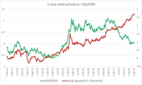 The chart above shows, how the relationship between USD/DKK and 2-year yield spread has unfolded since 2012. It can be seen that the pair and the yield spread between 2-year treasury and 2-year Danish government bond...