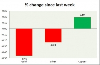 The metal pack is mixed today. Performance this week at a glance in chart table - Gold: Gold remains elevated over U.S. trade rift with China and a weaker dollar. Down today over a stronger dollar. Todays range...