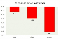 The metal pack is down today. Performance this week at a glance in chart table - Gold: Gold remains elevated over geopolitical tensions and a weaker dollar. Down this week after 5 consecutive weekly bull run....