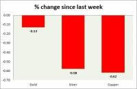 The metal pack is down today. Performance this week at a glance in chart table - Gold: Gold remains elevated over geopolitical tensions and a weaker dollar. Down this week after 5 consecutive weekly bull run....