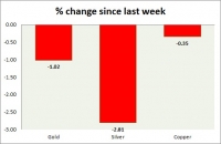 The metal pack is down today. Performance this week at a glance in chart table - Gold: Gold is declining sharply after a failure to break key resistance line. Todays range $1270-1254 In the short-term price is...