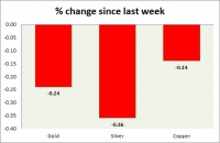 The metal pack is down today. Performance this week at a glance in chart table - Gold: Gold is testing key resistance line. Todays range $1256-1269 In the short-term price is likely to decline to $1190...