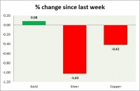 The metal pack is down today. Performance this week at a glance in chart table - Gold: Gold is marginally higher today, after a big selloff last week. Todays range $1204-1215 In the short-term price is likely...