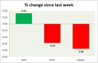 The metal pack is mixed today. Performance this week at a glance in chart table - Gold: Gold is marginally higher today but down from its recent peak as geo-political tensions subside. Todays range...
