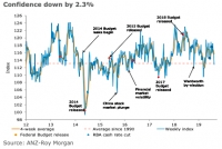 Australias ANZ-Roy Morgan consumer confidence fell 2.3 percent last week, closing below the long-term average. The fall was driven by weakness in economic conditions, with current falling 3.8 percent and future losing a...