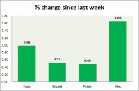 Dollar index trading at 96.67 (-0.31%) Strength meter (today so far) Euro +0.24%, Franc +0.08%, Yen +0.77%, GBP +0.11% Strength meter (since last week) Euro +0.98%, Franc +0.48%, Yen +1.65%, GBP +0.52% EUR/USD...