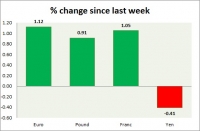 Dollar index trading at 95.34 (-0.25%) Strength meter (today so far) Euro -0.17%, Franc -0.14%, Yen -0.30%, GBP -0.37% Strength meter (since last week) Euro +1.12%, Franc +1.05%, Yen -0.41%, GBP +0.91% EUR/USD...