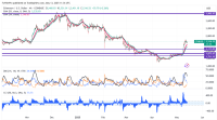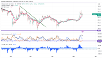 BNB/USD pared some of its gains due to profit-booking. It hit a high of $692.70 yesterday and is currently trading around $654. Overall bias remains bullish as long as support $500 holds. It trades above the 34 and 55...