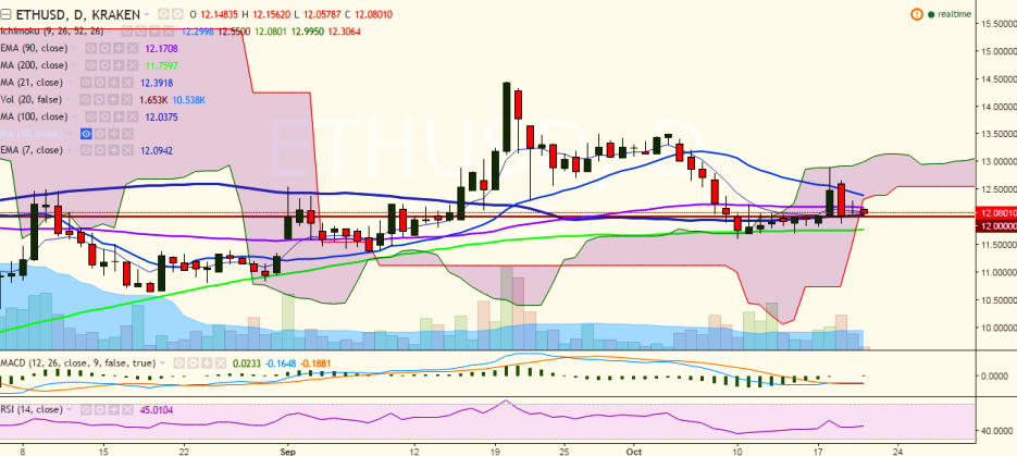 ETH/USD is facing strong support at 100-day MA and is trading at 12.05 levels (Kraken).
