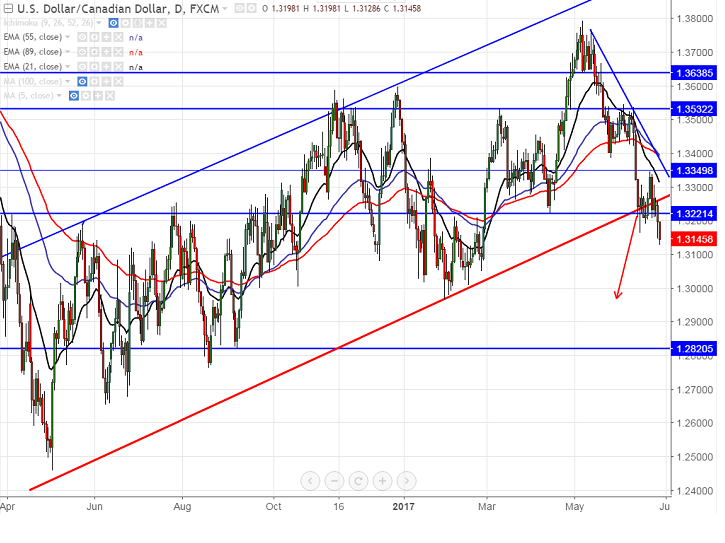 - USD/CAD has broken temporary support of 1.31650 low made on Jun 14th 2017 after 8 days of consolidation. The pair declined till 1.31286 and is currently 1.31464