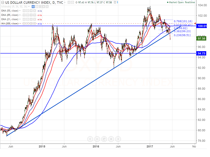 - On the lower side, major near term support is around 97.33 (161.8% retracement of 98.86 and 101.34) and any break below will drag the index till 95.91 (Nov 9th 2016 low)/95.