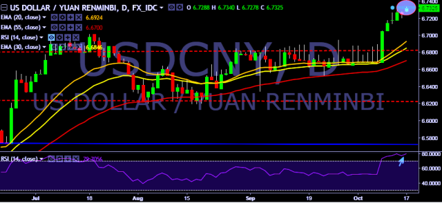We prefer to take long position in USD/CNY around 6.7275, stop loss at 6.7055 and target of 6.7583.