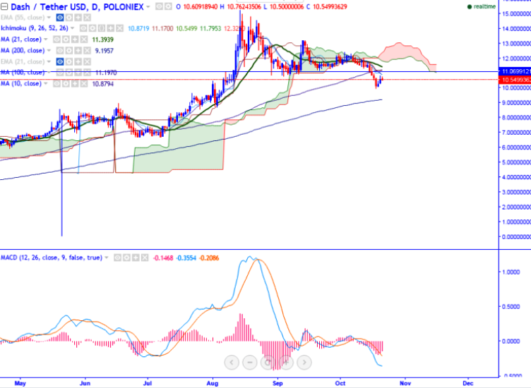 The pair jumped slightly from the low of USDT10.11 made yesterday (Poloniex). It is currently trading around USDT10.65 at the time of writing.