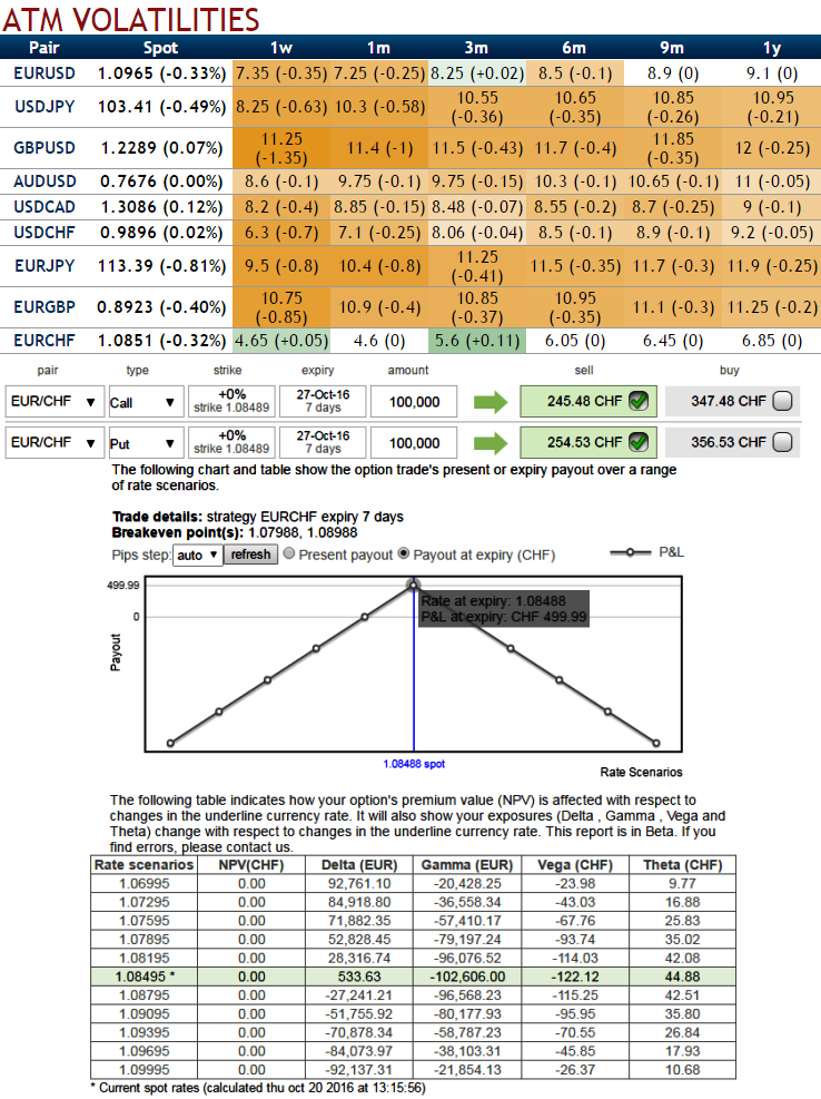 Expect certain returns on shorts of EURCHF straddles as long as spot EURCHF remains relatively range-bound in next one week time since we initiated this trade in expectation of post-policy meeting consolidation in the cross.