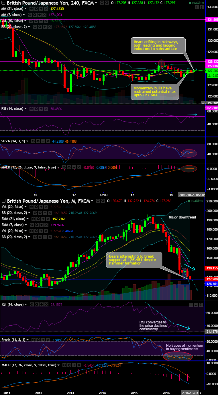 Bears have been drifting in sideways, both leading and lagging indicators to substantiate. Thereby, we could understand that the momentary bulls have restrained potential maximum up to 127.604.