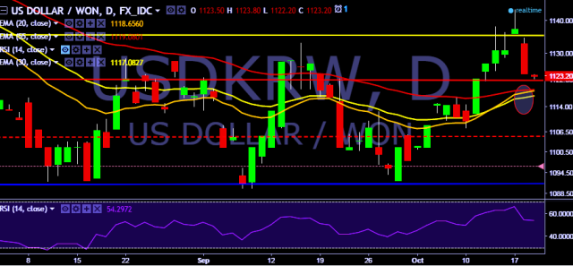 We prefer to go short on USD/KRW only below 1,122, stop loss 1,135 and target 1,111/1,101.