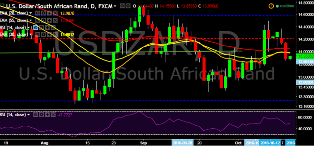 We prefer to go short on USD/ZAR around 14.00, stop loss 14.15 and target of 13.86/13.70.