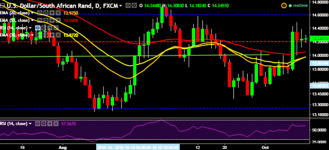 We prefer to go short on USD/ZAR only below 14.18, stop loss 14.35 and target of 13.96/13.70.