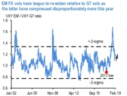 An odd by-product of the nosedive in G7 vol has emerged: EM vs. G7 vol spreads are re-widening, not because risk premia in EM are rising as was the case last year quite the opposite in fact but because G7 options have...