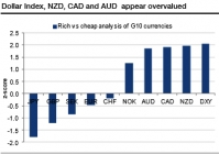 AUDUSD and NZDUSD vols appear the cheapest within the G10 space, based on the relative-value analysis for ATM vols. As we can see from the below-left chart, Kiwi vol trades near one-year lows and is undervalued by 1.8...