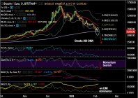 BTC/EUR has extended downside after decisive break below major trendline support. The pair has shown a breach at major support at 200-DMA, currently at 6626. Technical studies are biased lower. We see -ve DMI...