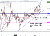 Major resistance 153 (trend line joining 151.97 and 152.81). GBP/JPY has broken major resistance 153 yesterday and jumped till 153.34. The pair formed a minor bottom around 151.50 and any major weakness only below...