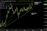AUD/NZD corrects lower from 1 1/2 year highs at 1.1289 (Oct 24 high), slips below 1.12 handle. The pair 0.11% down on the day, hovers around 1.1175 levels, bias lower. Price action has slipped below 5-DMA support...