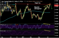 NZD/USD is extending previous sessions retracement from fresh 9-month highs at 0.7387. The major has likely formed a triple top and that coupled with bearish divergence on RSI and Stochs suggests an impending...