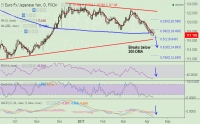 Major support -82 (200 day MA). CADJPY declined after showing a minor jump till 83.37 on Apr 10th 2017. The pair is still weak as long as resistance 83.50 (trend line joining 87.72 and 85.89) holds. The near term...