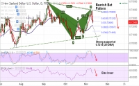 Bearish Bat pattern formed on NZD/USD dailies. The pair is extending downside from multi-week highs at 0.74 handle. RBNZ spike quickly faded, pair slips below 0.73 handle. RBNZ decided to cut cash rate by 25...