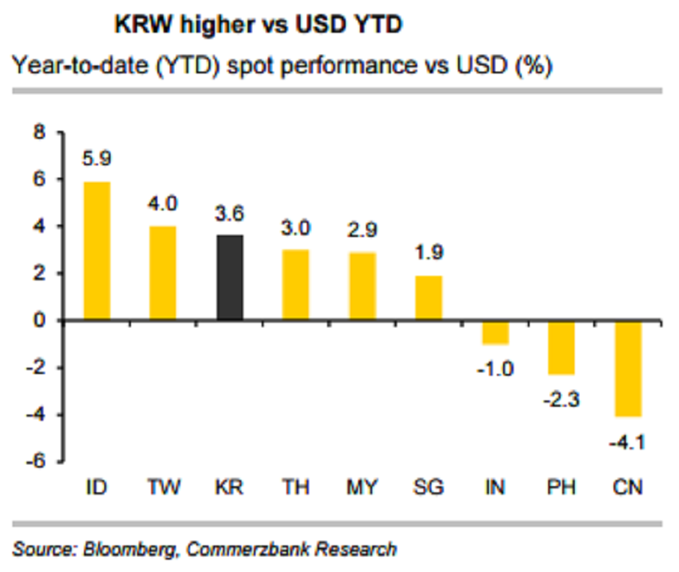 On the FX front, the KRW has strengthened by 3.6% against the USD on a year-to-date (YTD) basis. This makes it the third best performing Asia ex-Japan currency, behind the IDR (+5.9%) and TWD (4.0%) and above the average of 1.5% for the Asia ex-Japan currencies.
