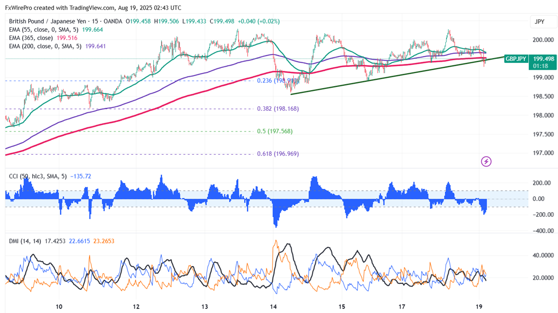 The pair is trading below 55 and 200 EMA and 365 EMA (long-term) on the 15-minute chart, confirming a bearish trend. Any violation below 199.20 indicates the intraday trend is weak. A dip to 198.85/198.60/197.75/196.70/196.20/195.is possible. Immediate resistance is at 200.30; a breach above this level targets 202/202.98.