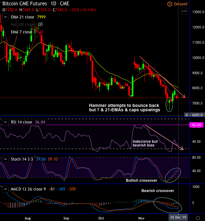 Derivatives (Futures & Options) trading is one of the popular trading mechanisms in the conventional financial markets, and it is no exception for the cryptocurrency avenues as well. CME BTC Futures price chart shows previous gap-up is now filled-in, gap-down pattern has now formed, and reckon good time to build fresh longs around $6-6.5k levels on oversold sentiments during the expiration. One can make out back-to-back hammer candles formation at 7330 and 7165 levels respectively.