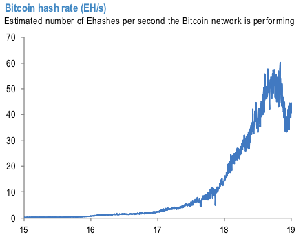 Following the declines in cryptocurrency values in November and early December, we noted the decline in Bitcoin mining activity too as profitability also collapsed (F&L, Dec 14), following a significant increase during 2018 boosted by improvements in technology. After a modest recovery in prices in the second half of December, mining activity recovered somewhat (refer 1stchart).