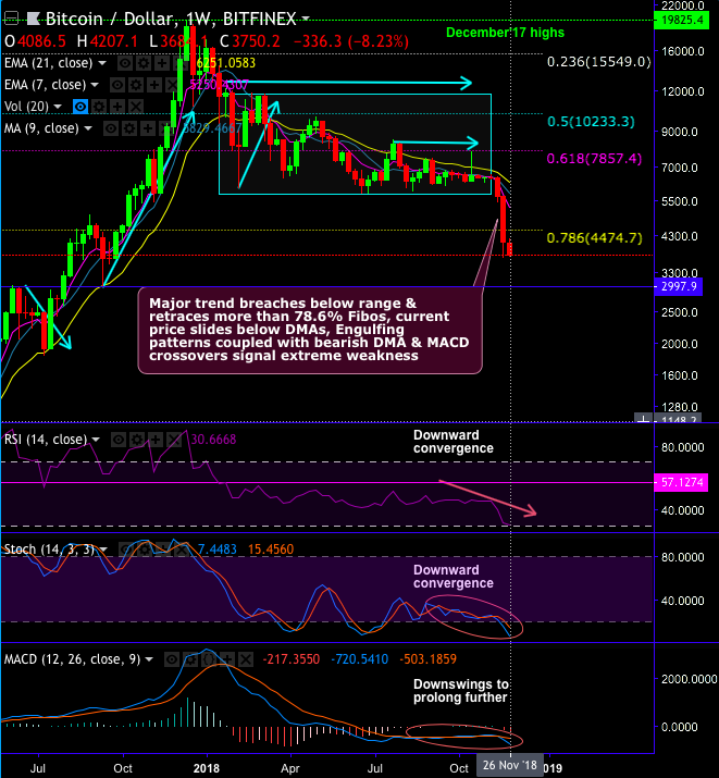 As flurry of bearish streaks in cryptocurrencies has halted for today, but earlier BTCUSD tumbled to fresh 13-month lows at $3,760, while ETHUSD showed slumps upto $104.80 levels as the bearish momentum is intensified in both trends (as shown in the above technical charts), prolonging a continuous selloff that wiped-off almost $75 billion off the collective market cap.