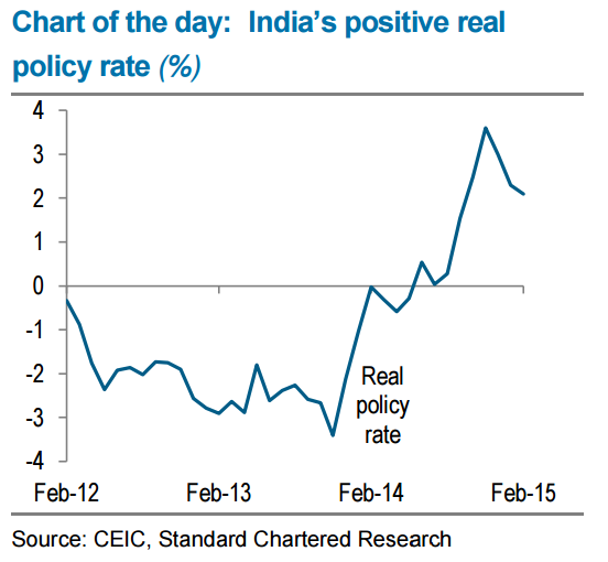- It may consider measures to improve monetary policy transmission. Given our expectation that CPI inflation will average around 5.4% in FY16 (year ending March 2016), and assuming the RBI is comfortable with the real policy rate at 150-200bps, we see scope for another 25-50bps of rate cuts.