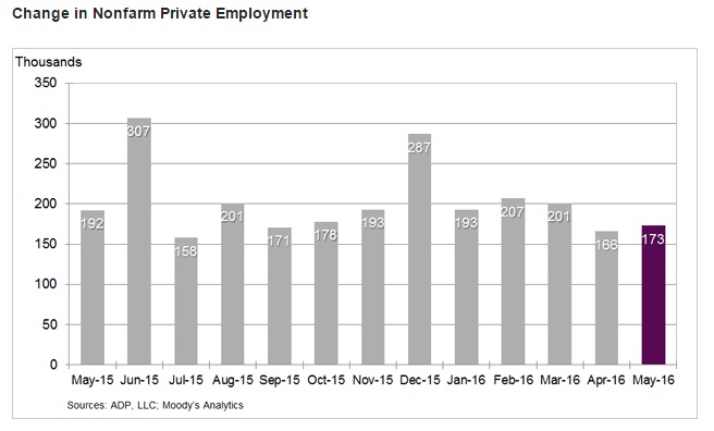 - Non-farm private sector employment grew at 173,000 in May. In April payroll grew by 166,000.
