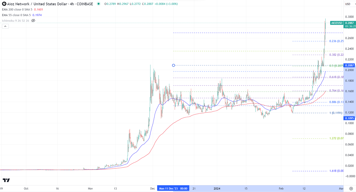 AIOZUSD surged nearly 150% in the past two weeks. The pair holds above the short-term (21 and 55 EMA) and above the long-term moving average. It hit a high of $0.2967 and is currently trading around $0.2915.