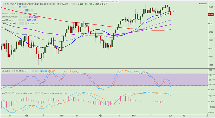 - ASX200 has broken major support at 5340 and declined till 5303. It is currently trading at 5308.